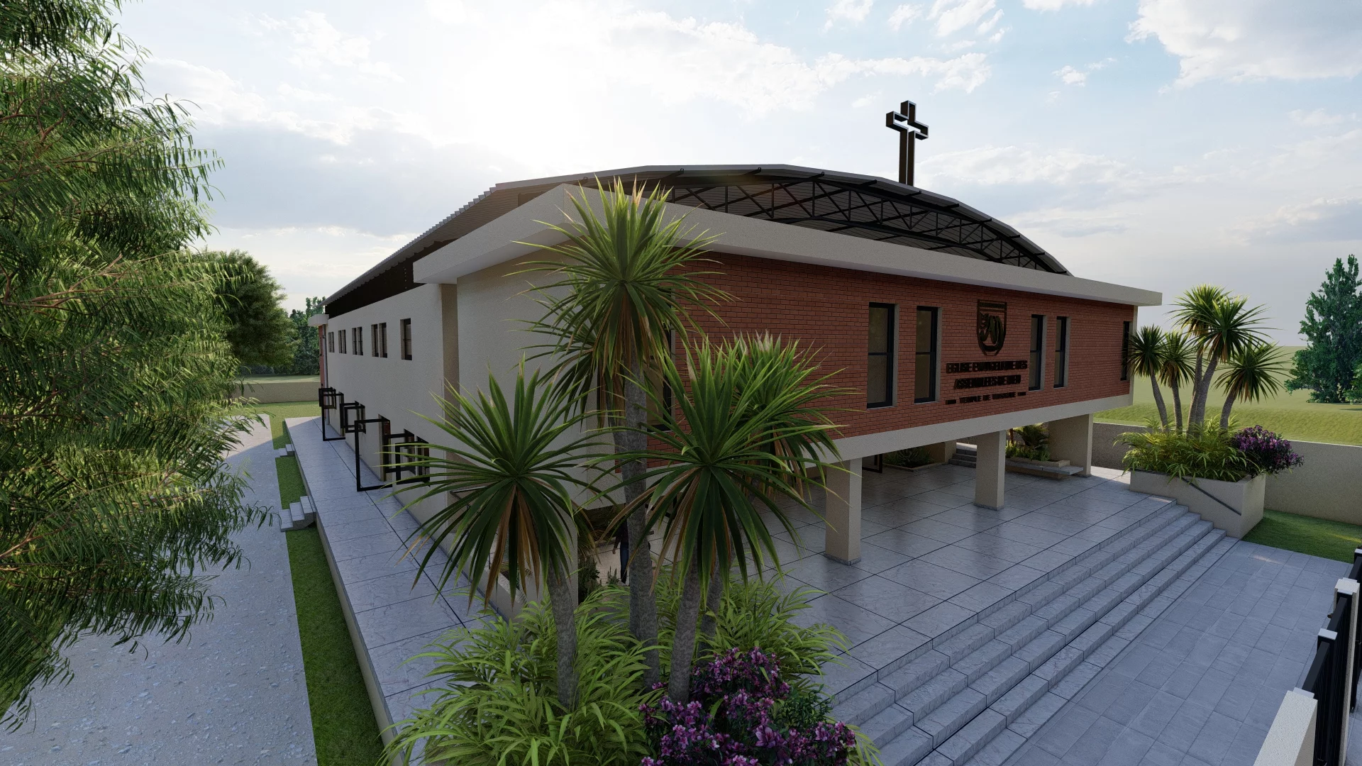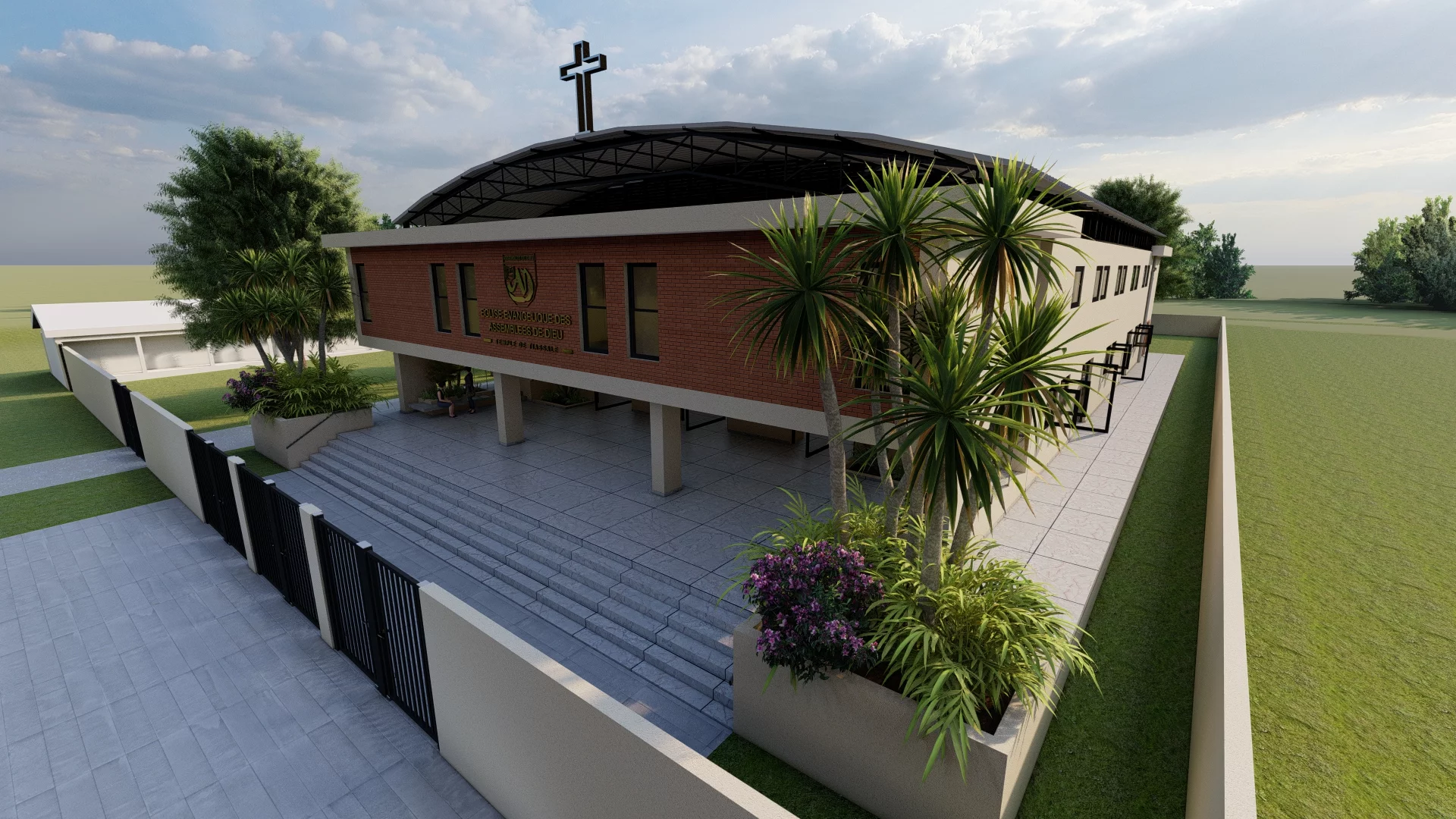 Ce projet transforme le hangar en un lieu de culte épuré où l’aspect industriel s’efface derrière une architecture accueillante. L’entrée s’ouvre sur un parvis extérieur menant directement à une vaste salle de culte de plain-pied, conçue comme un espace unifié sans piliers encombrants.